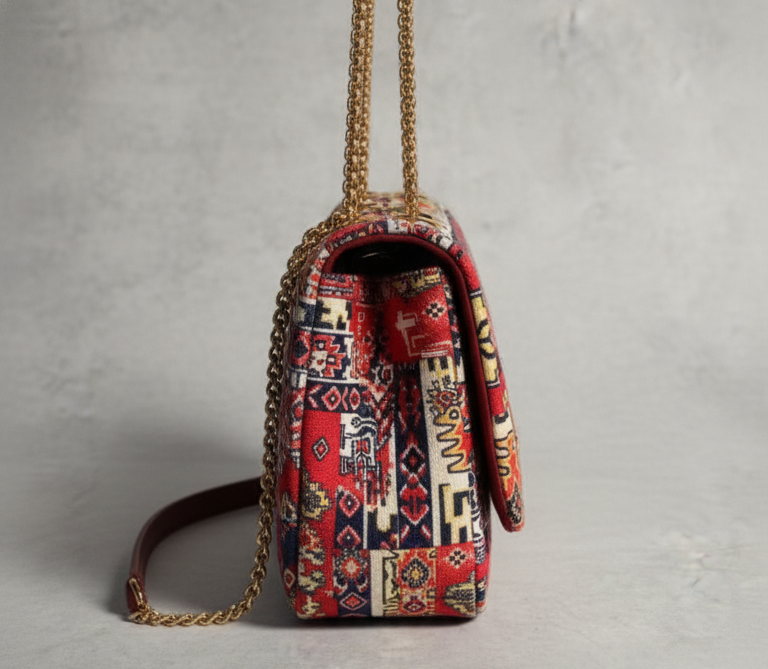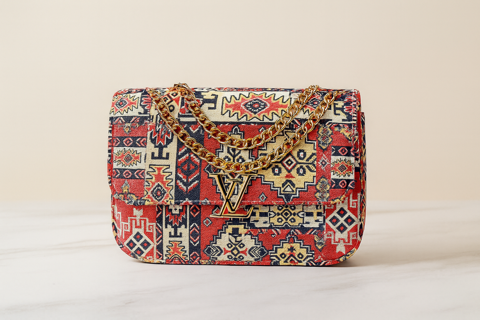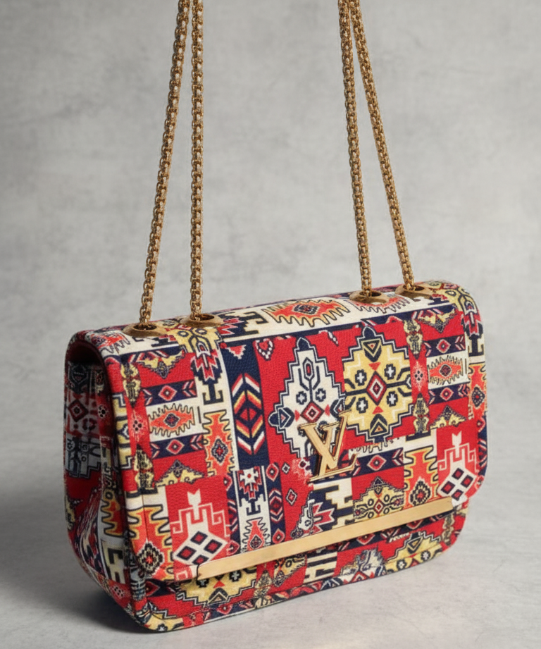 Finished with a Tribal Luxe Chain Bag and a sleek metallic front emblem, this bag blends traditional artistry with contemporary elegance. Its structured shape provides enough space for your essentials while maintaining a stylish, compact silhouette.